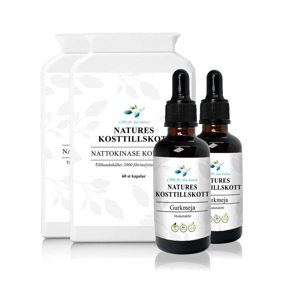 Nattokinas är en proteas, det vill säga ett enzym som bryter ner proteiner. Vi har satt ihop den med Gurkmeja som innehåller det aktiva ämnet Curcumin för en bra kombination. Rek intag:3 kapslar Nattokinase och 40 droppar Gurkmeja.